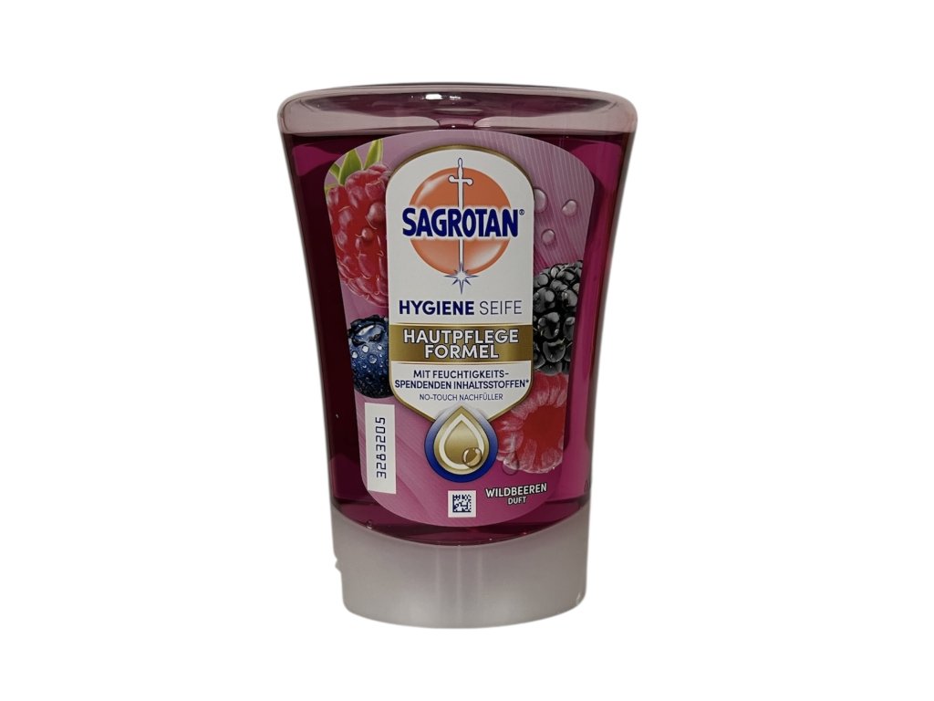 Tekuté mýdlo No Touch náhradní náplň Lesní plody ze sortimentu značky Sagrotan je šetrné k pokožce, ale účinné proti bakteriím. Mýdlo s okouzlující vůní lesních plodů má antibakteriální účinek a přesto čistí mimořádně jemně.